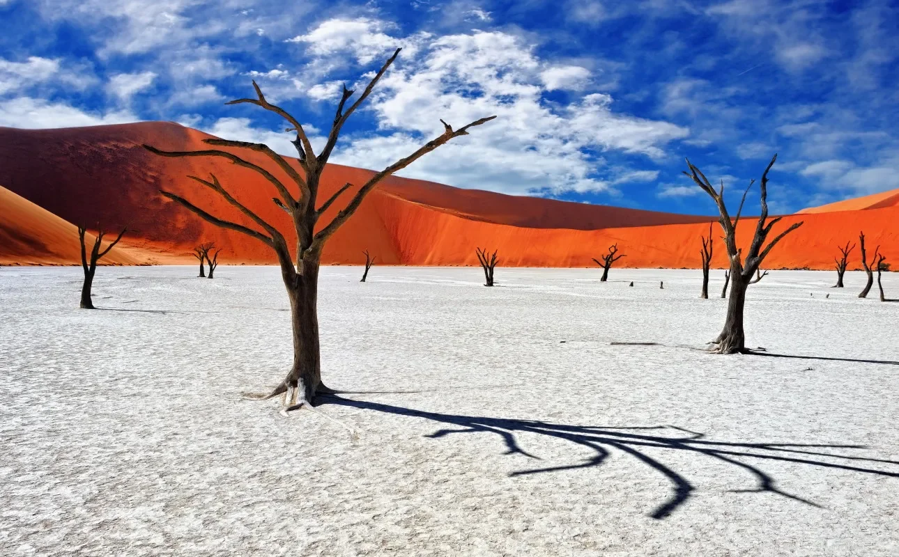 Within the heart of Sossusvlei lies Deadvlei, a clay pan dotted with ancient, petrified camelthorn trees that have stood for over 600 years. Their dark silhouettes against the white clay floor and fiery dunes create one of the most photographed landscapes in the world. Visiting at sunrise ensures soft light and fewer crowds, making the moment feel intimate and almost surreal.